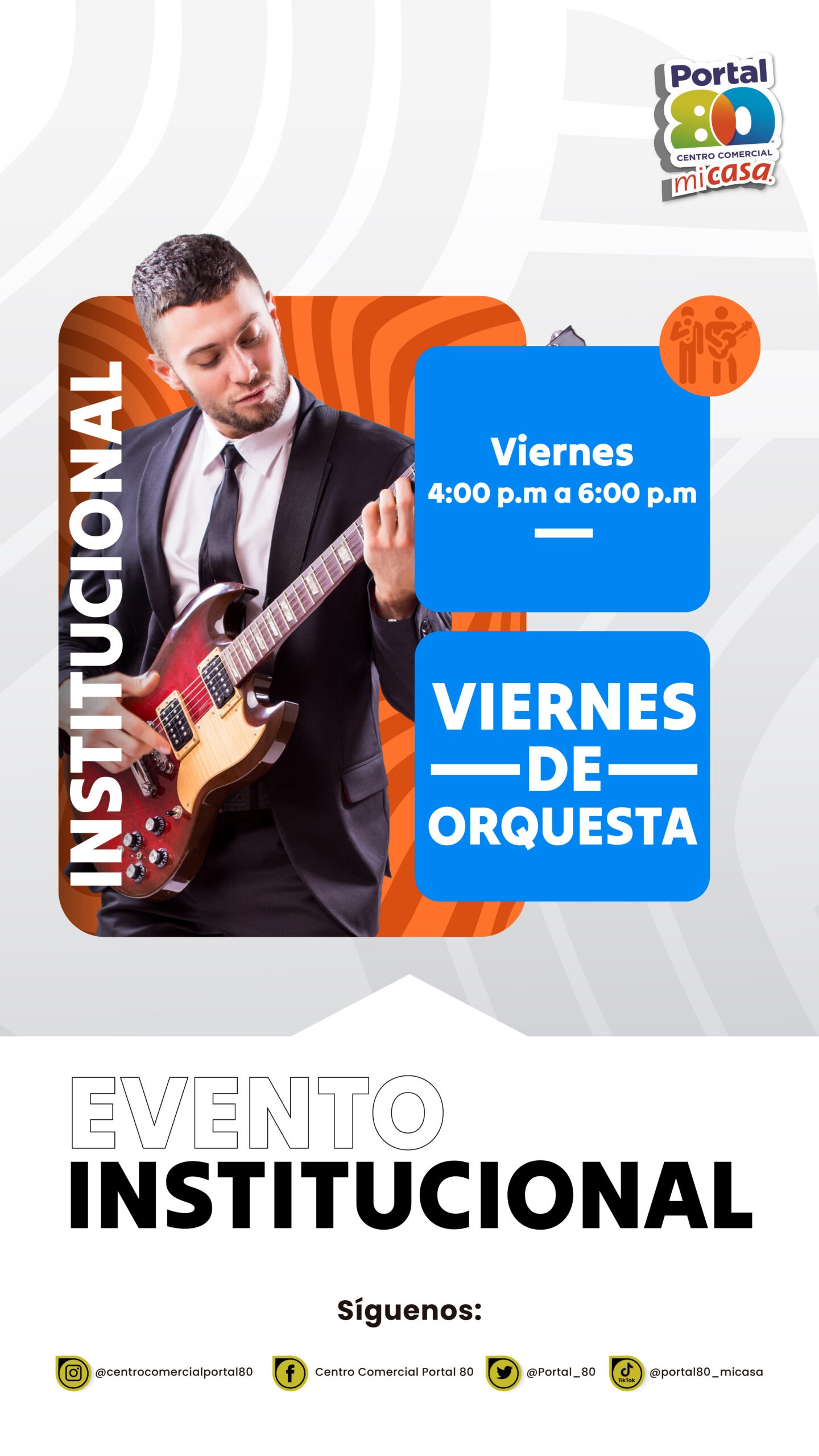 Déjate contagiar por la música en vivo en nuestros Viernes de Orquesta, una experiencia para disfrutar en familia y con amigos. Te esperamos todos los viernes de 6:00 pm a 8:00 pm en el centro comercial.